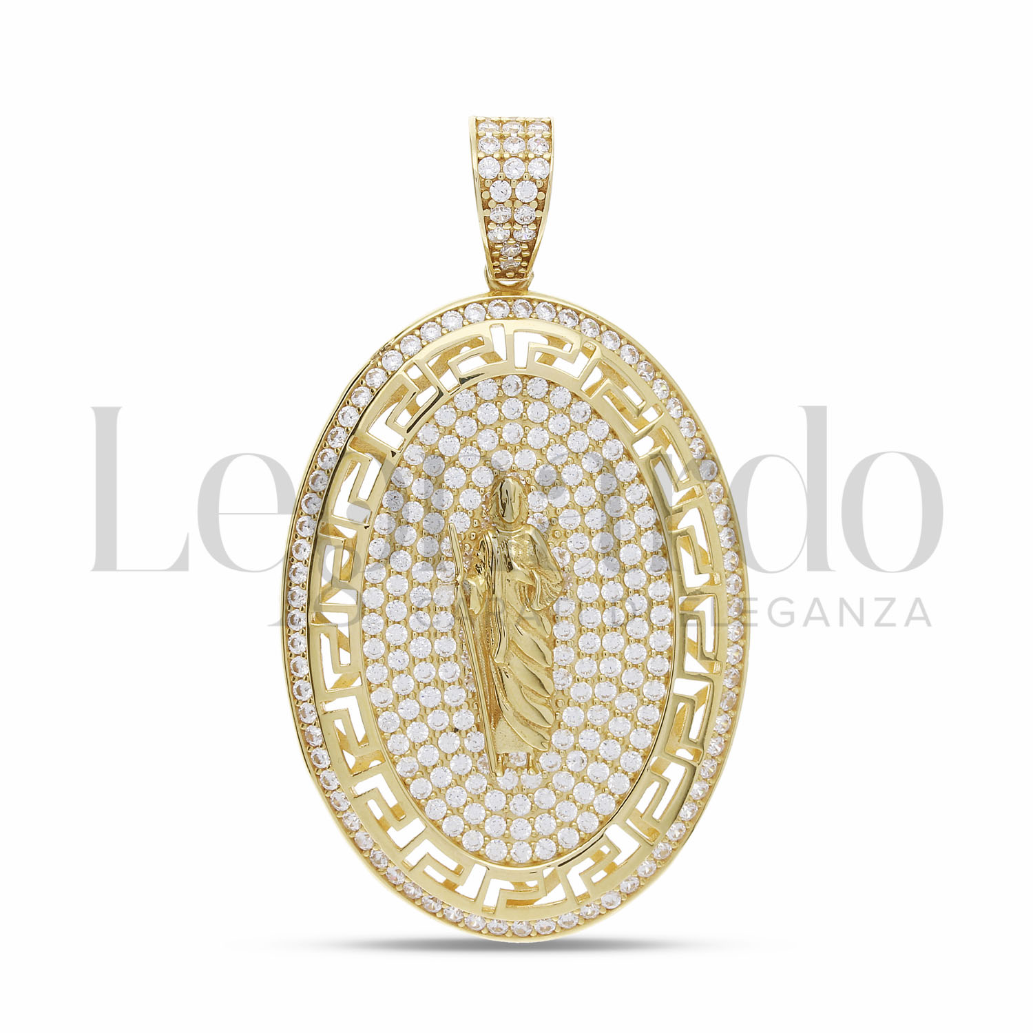 Pendente Sacro, Medaglia Con San Giuseppe, con Pavè di Zirconi Bianchi e greca sul bordo in Oro Giallo.