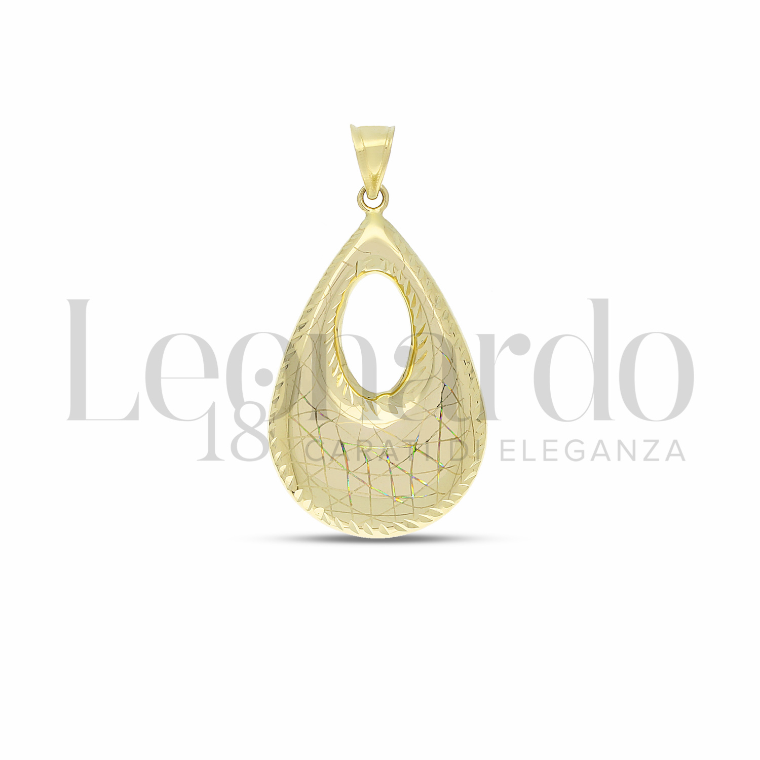 Pendente Fantasia, a forma di Goccia, Modello Double Face, Finitura Lucida e Diamantata Olografica in Oro Giallo.