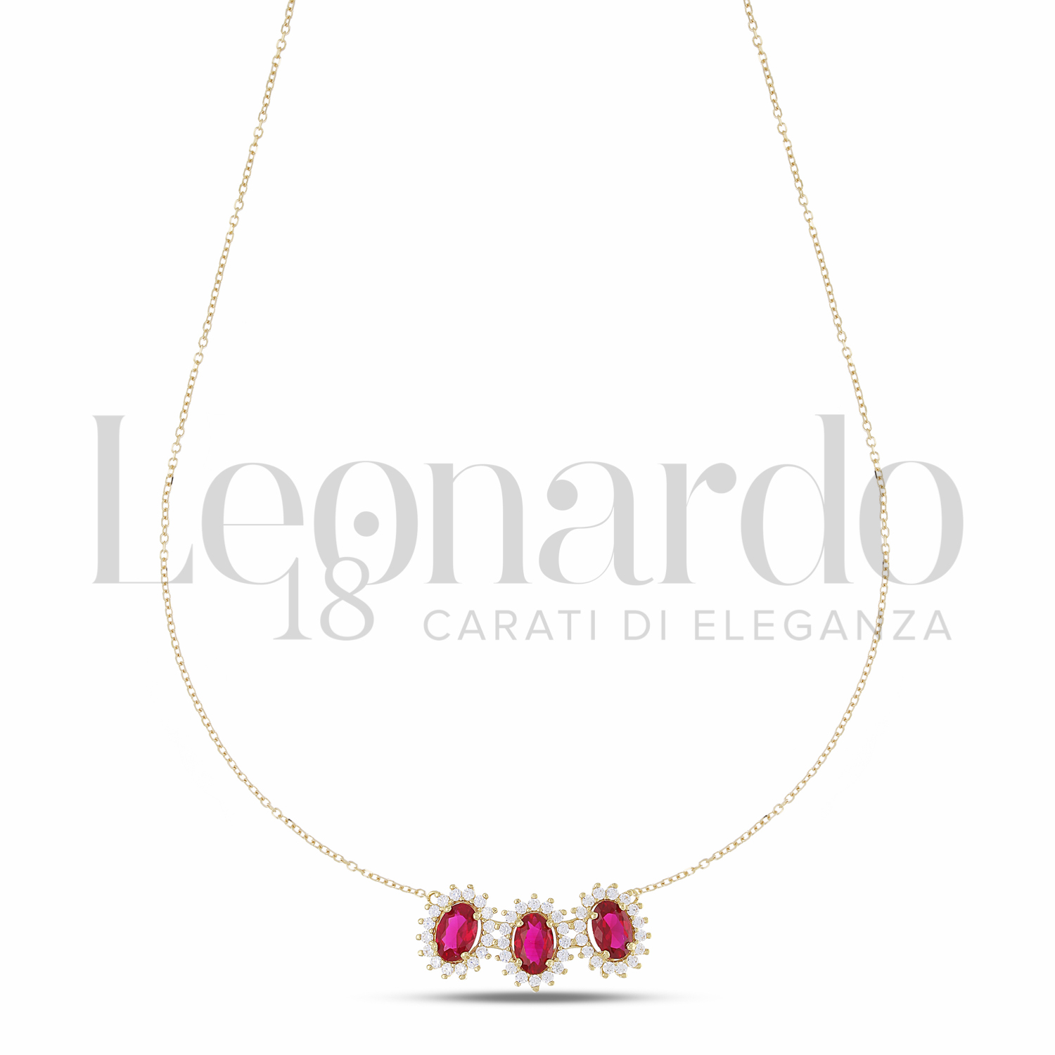 Pendente da Donna Ovale di Colore Rosso, contornato da una fila di Zirconi Bianchi, Modello Trilogy Kate 1° misura, con Catenina Passante, in Oro Giallo.