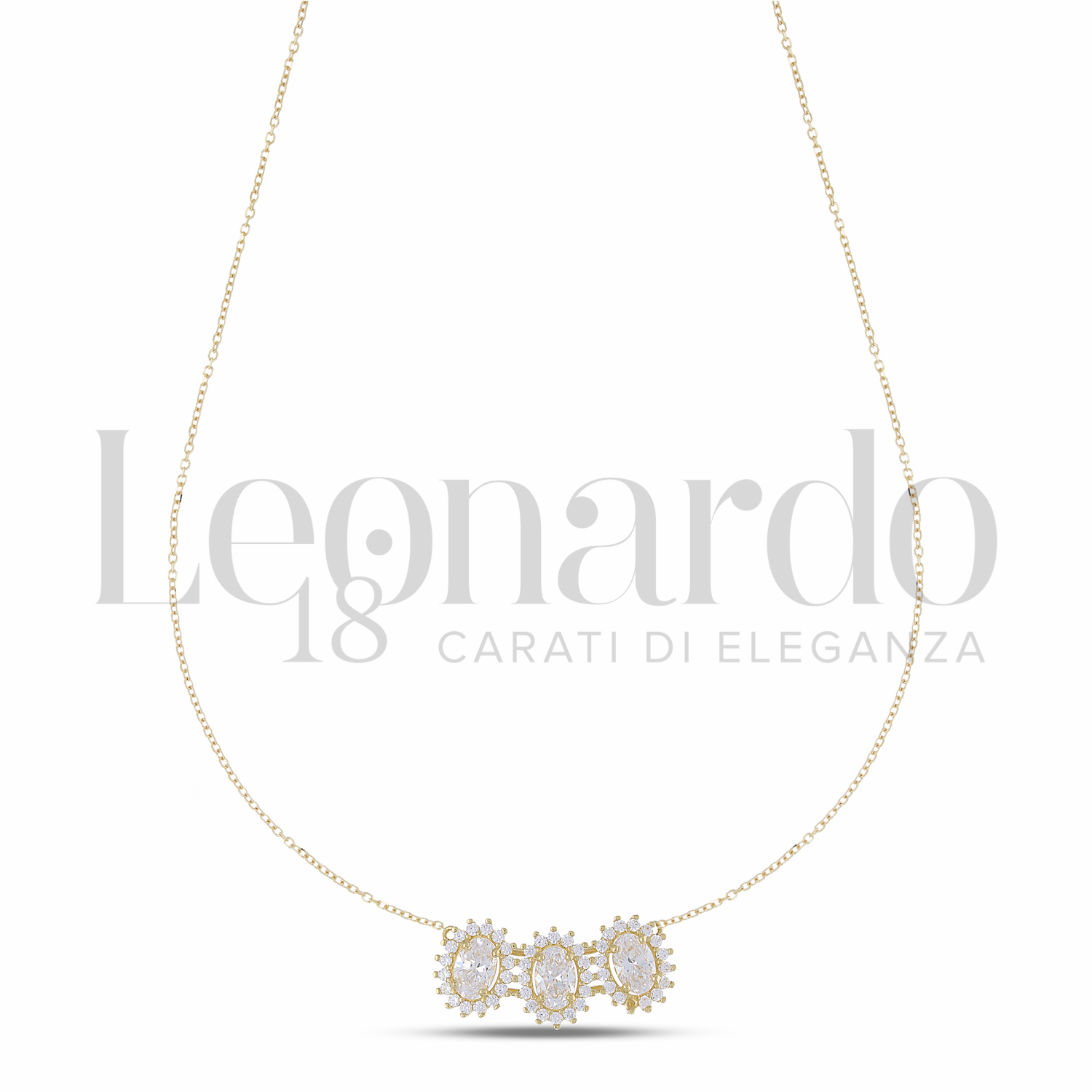 Pendente da Donna Ovale di Colore Bianco, contornato da una fila di Zirconi Bianchi, Modello Trilogy Kate 1° Misura, con Catenina Passante, in Oro Giallo.