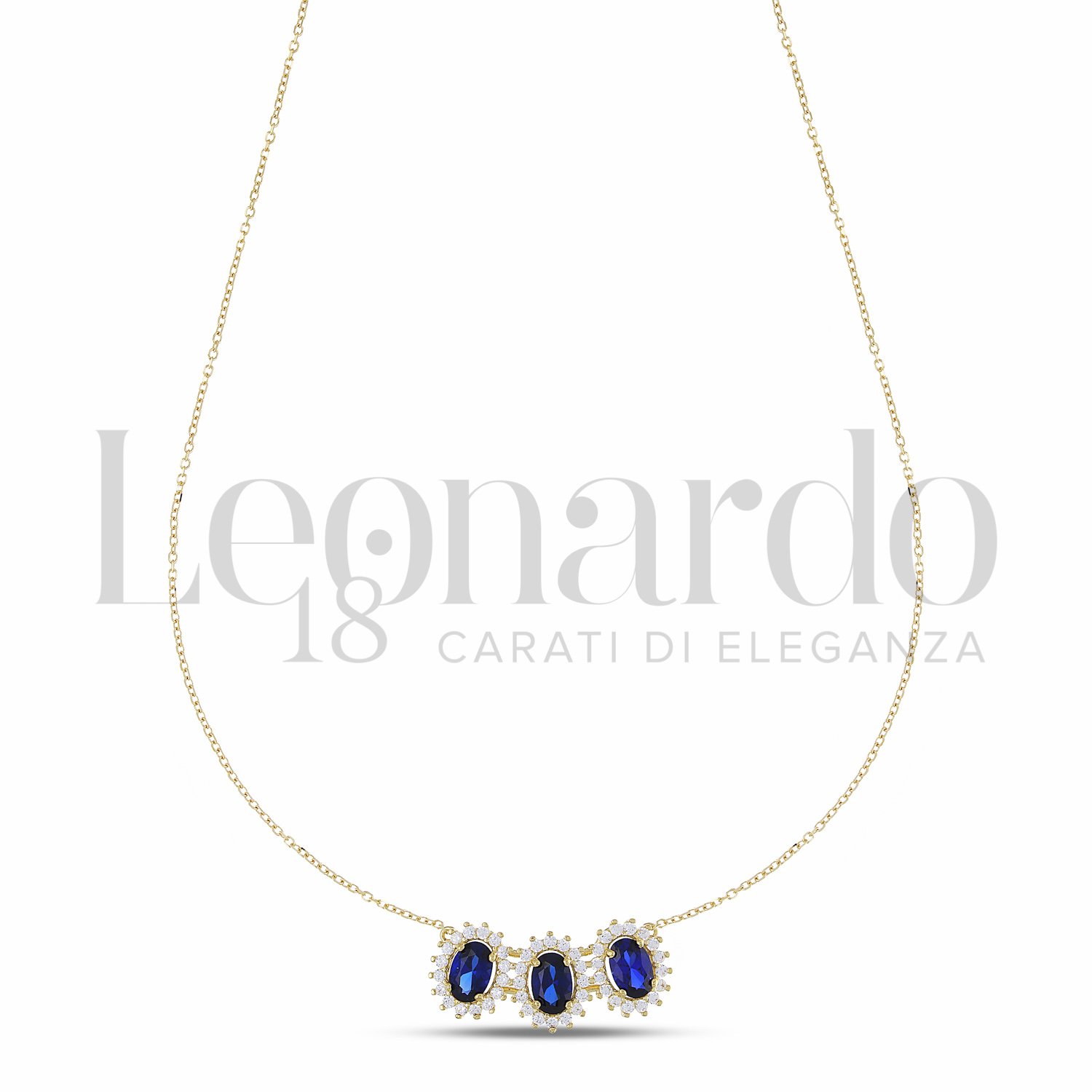 Pendente da Donna Ovale di Colore Blu, contornato da una fila di Zirconi Bianchi, Modello Trilogy Kate 1° Misura, con Catenina Passante, in Oro Giallo.