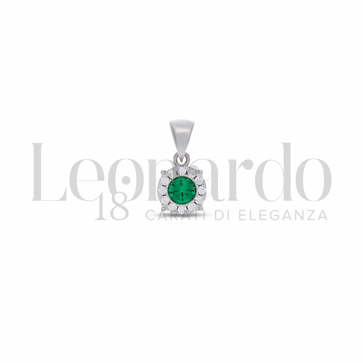 Pendente da Donna, forma tonda, con pietra di colore verde, contornato da una fila di zirconi bianchi, in Oro Bianco.