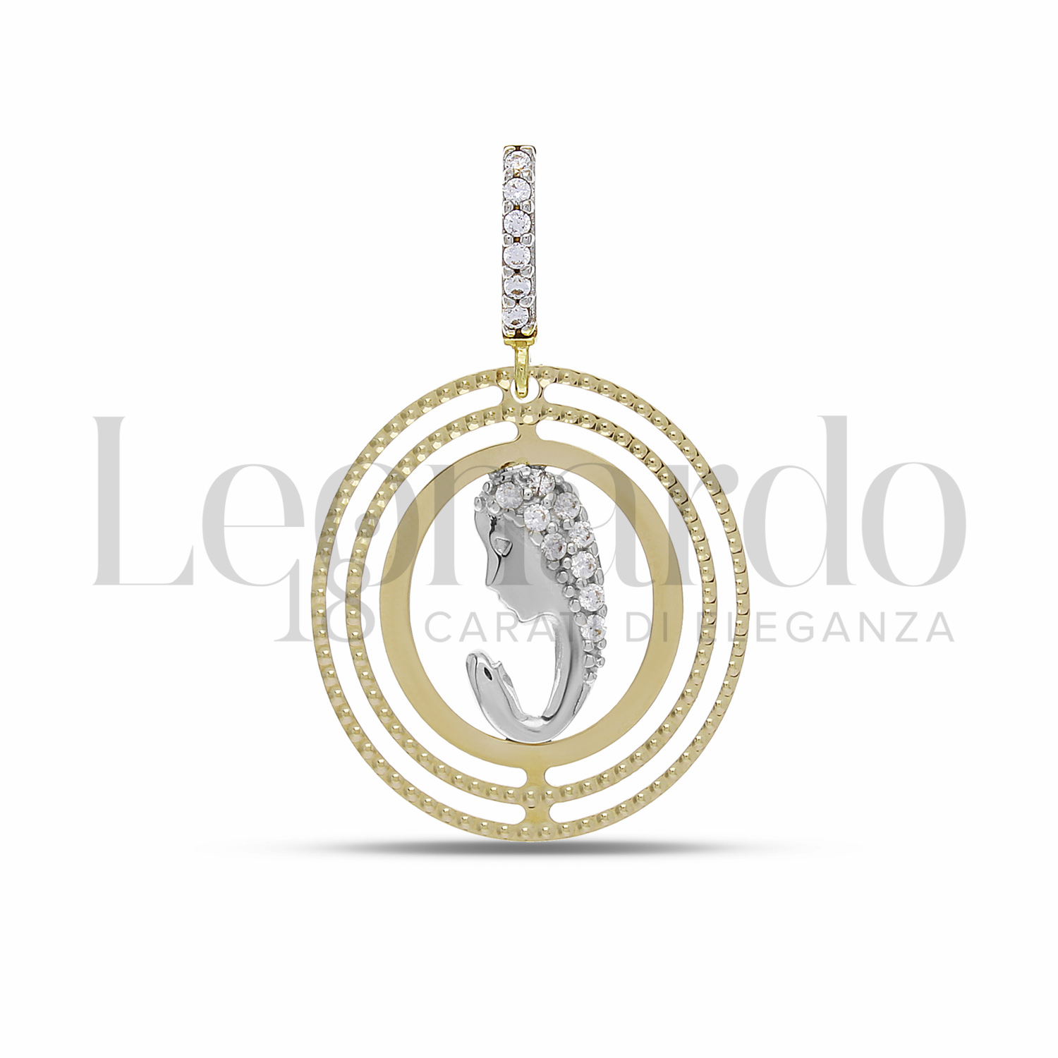 Pendente da Donna, di forma tonda, Madonna in preghiera, con zirconi bianchi, 1° misura, in Oro Giallo e Oro Bianco.