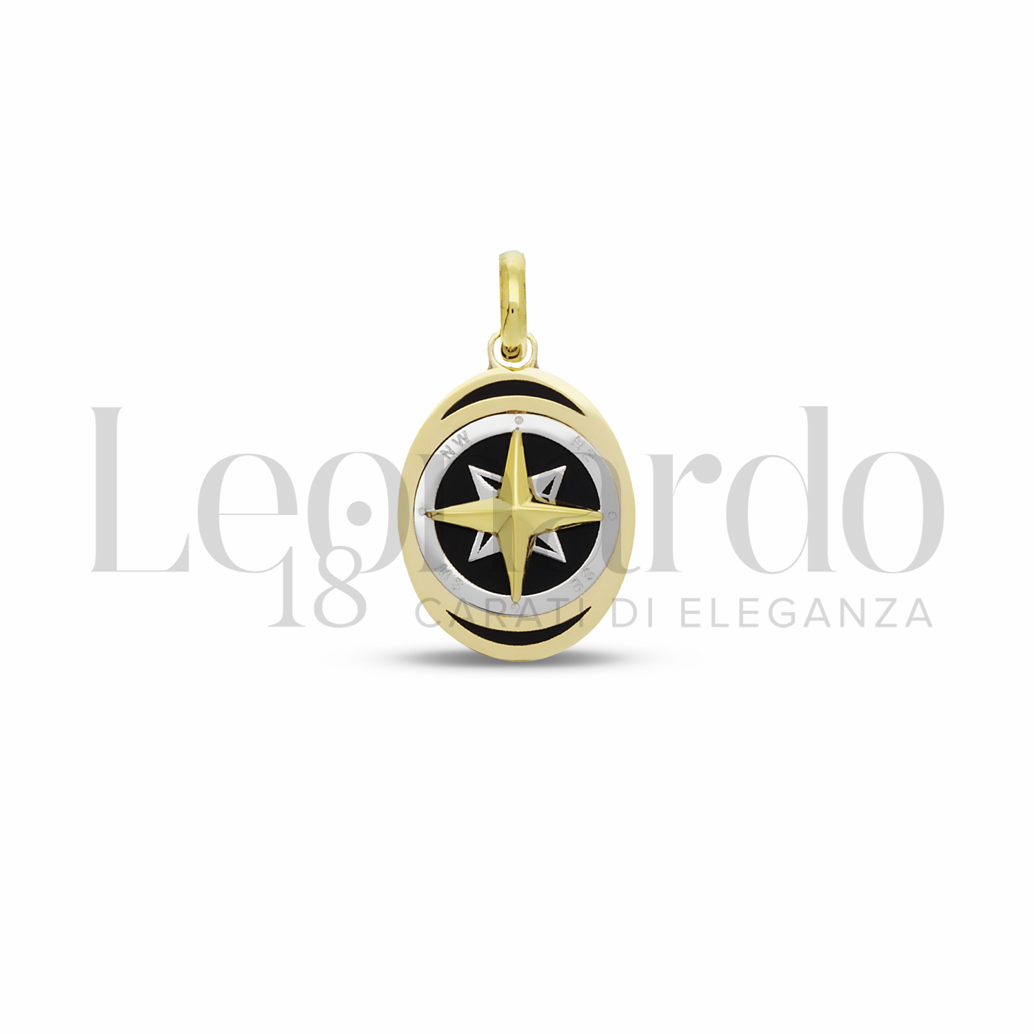 Pendente da Uomo con Rosa dei Venti e Onice, 2° misura, finitura Lucida, in Oro Giallo e Oro Bianco.